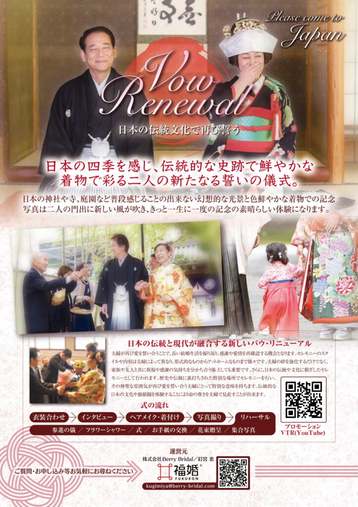 日本の神社や歴史ある場所で、和装をまとい、ご夫婦の歩みを大切にする“感謝と再出発”の時間を演出します。